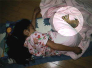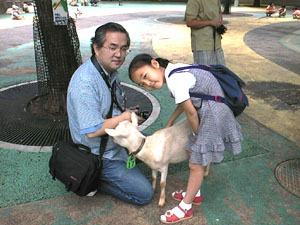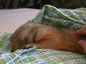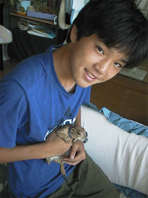チュウコ姉ちゃん。 ボク大好き!!だってチュウコ姉ちゃんご飯くれるんだもん。ときどき山盛りサ−ビスもしてくれる。嬉しくてたまにまちがえて指をかじってもチュウコ姉ちゃんは怒ったりしないよ。やさしいんだぁ、とっても。 チュウコ姉ちゃんとおんなじ格好で寝ているボク。 チュウコ姉ちゃんのピンクのもーも(綿毛布)がボクのお気に入りなんだ。ここに来た頃はよくチュウコ姉ちゃんと一緒に寝かせてもらったっけ。 小学生なんだ。 |