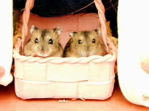 ボクの家族を紹介するね。 まず、パパ。 まるっこくて、かじりやすくて、登ったりおりたりすべったり、ちょうどいい遊び道具的存在。ねずみのくせに人を置物かなんかと勘違いしているって不機嫌そうにいう。 そのくせ、ボクが遊んであげるととっても嬉しそうなんだ。 写真はパパとチュウコ姉ちゃん。二人はとっても仲良し。 |
